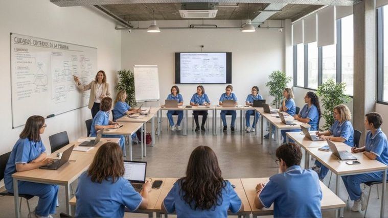 Un grupo de trabajadoras asisten a una clase de formación para trabajar en un centro sociosanitario de atención a la Dependencia. (Foto: Gemini)