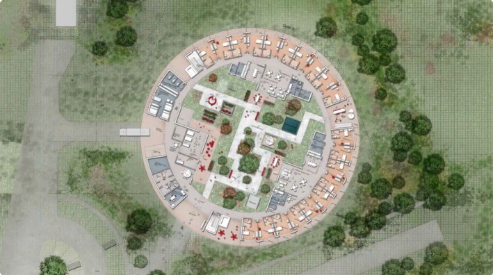 Capacidad: 50 plazas en habitaciones privadas, organizadas en una planta circular de dos niveles alrededor de un patio central