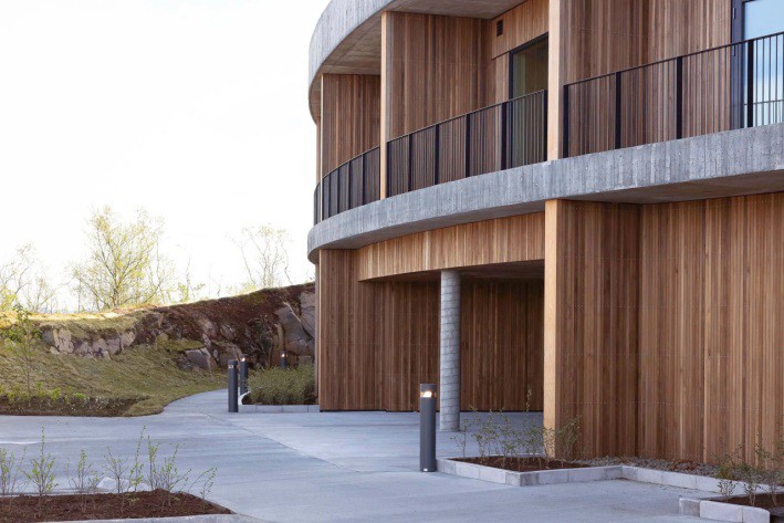 Uno de los aspectos más destacados del edificio es su construcción material. Predominan el hormigón, la madera y el vidrio. El hormigón se ha ejecutado con áridos y componentes vinculados a recursos locales, incluyendo ceniza volcánica, mientras que la madera se incorpora como elemento de revestimiento y calidez. Esta combinación resulta especialmente interesante porque logra equilibrar la robustez necesaria para responder al clima islandés con una atmósfera más doméstica y amable.